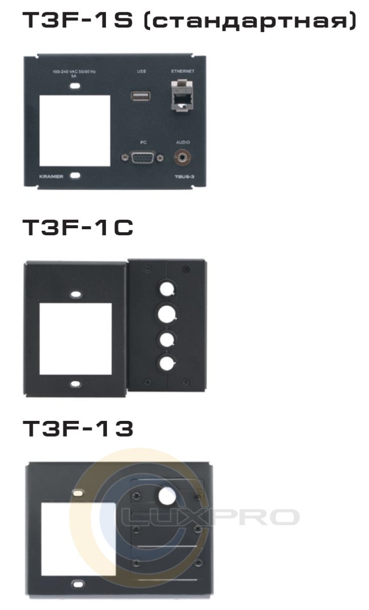 - T3F-1S - Стандартная рамка с отверстием под 1 сетевую розетку TS-1DE, 1 разъемом USB, 1 разъемом VGA, 1 разъемом RJ-45, 1 аудиорозеткой 3,5-мм;
