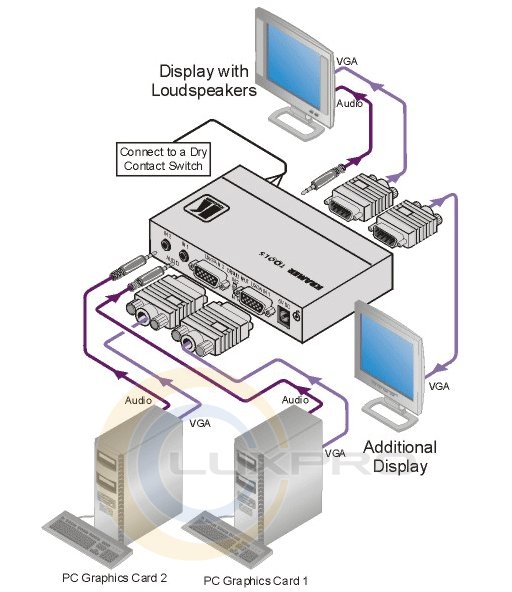 VP-211K - высококачественный коммутатор 2x1 для компьютерного графического сигнала UXGA и более высоких разрешений, а также небалансного стереофонического аудиосигнала. Прибор может использоваться для автоматического подключения резервного источника при потере видеосигнала на основном (наличие аудиосигнала не контролируется).Особенности:
