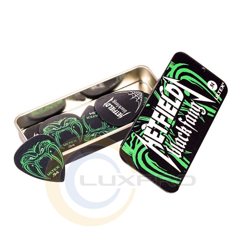 HETFIELD'S BLACK FANG PICK TIN 0.94 - медиаторы. За основу был взят классический дизайн, изготовленный из жесткого и прочного материала Ultex, обеспечивающего четкий тон и острую атаку. Кроме этого у заказной модели появился острый и контурированный наконечник для скорости и четкости - идеальная находка для тех, кто хочет добиться ясного, быстрого и четкого звучания. "Он быстрый, яркий и прочный благодаря острому наконечнику и структуре материала," резюмирует Джеймс. "Этот медиатор - как раз то, что нужно — просто яд."