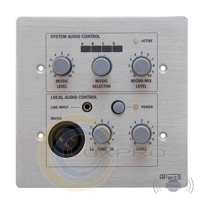 APart PM1122RL - проводная панель управления для предусилителя PM1122, позволяет регулировать громкость микрофонов, громкость фоновой музыки и выбрать источник фоновой музыки. APart PM1122RL имеет возможность подключения локального микрофона к разъему XLR и/или источника линейного аудио сигнала к разъему mini Jack на передней панели. К разъему mini Jack также могут подключаться источники аудио сигнала с выходом для наушников, такие как IPod, портативный MP3 проигрыватель или компьютер. Фантомное питание локального микрофона включается при помощи перемычки с обратной стороны панели управления.Панель устанавливается в монтажную коробку BTicino серии 506. Также вы можете использовать монтажные коробки поставляемые APart: настенную монтажную коробку BB2 с размерами 116 x 116 x 56 мм или встраиваемую в стену монтажную коробку BBi2 с размерами 93 x 101 x 40 мм. Винты для крепления панели к монтажной коробке поставляются в комплекте.Панель подключается к предусилителю при помощи стандартного кабеля CAT5 прямой разводки (компьютер - хаб), длиной до 300 метров. Одновременно может быть подключена только одна панель APart PM1122RL к каждой зоне предусилителя PM1122.Размеры APart PM1122RL : 93 x 101 мм (40 мм глубина за фланцем)Передняя панель PM1122RL- Регулятор громкости музыки