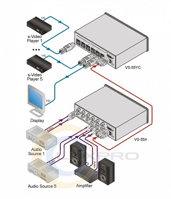 Разъем LINK предназначен для формирования системы коммутации с помощью коммутатора аудио сигналов VS-55A. Разъем EXT позволяет объединять несколько модулей VS-55YC в более разветвленные коммутационные системы. Например, объединение двух модулей позволяет получить коммутатор 10:1, трех - 15:1 и т.д. В комплект входит внешний источник питания 12 В. Также может использоваться блок питания VA-50P (опция), который обеспечивает электропитание до 6 устройств Kramer, рассчитанных на 12 В. Два модуля VS-55YC устанавливаются в стандартную 19” стойку с помощью комплекта RK-50RN (занимаемая высота - 1U).