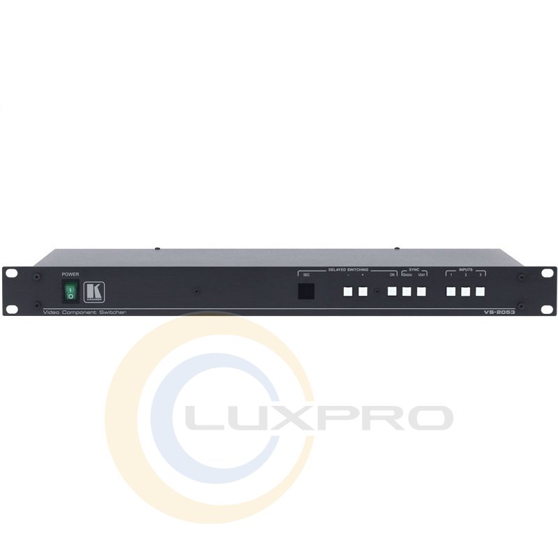 Прибор VS-2053. Переключение в интервале кадрового гасящего импульса применяется в телевещании и видеопроизводстве, обеспечивая переходы без подрывов между входами синхронизированных источников. Коммутация с задержкой применяется для обеспечения качественного перехода при работе с компьютерными сигналамивидео.Управление осуществляется при помощи кнопок на передней панели, а также по интерфейсу RS-232 с персонального компьютера, сенсорного экрана либо иного контроллера. В комплект входит ПО для Windows®. Благодаря полосе пропускания, превышающей 400 МГц, устройство является полностью прозрачным элементом на пути прохождения сигнала.