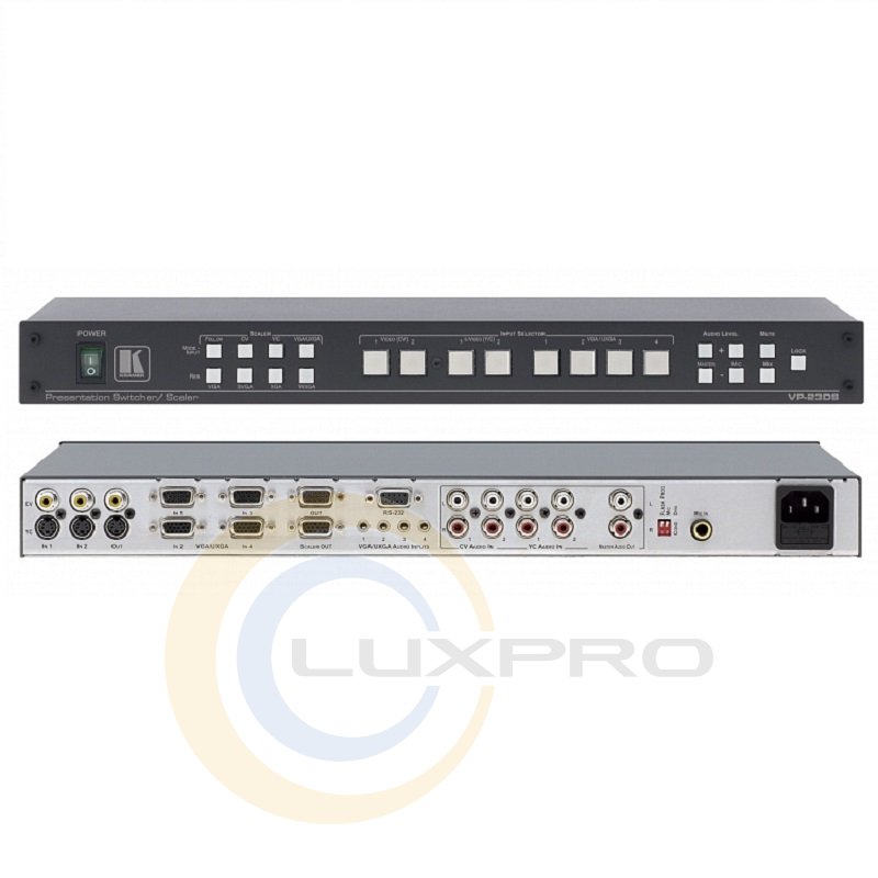 Прибор VP-23DS. В каждой секции также коммутируется стереозвук и имеется выход компьютерного графического сигнала, на который выдается либо масштабированный сигнал с композитного и s-Video входов, либо сигнал со входа компьютерной графики в проходном режиме.