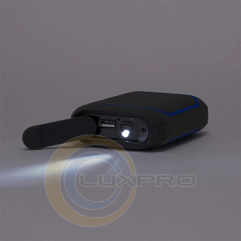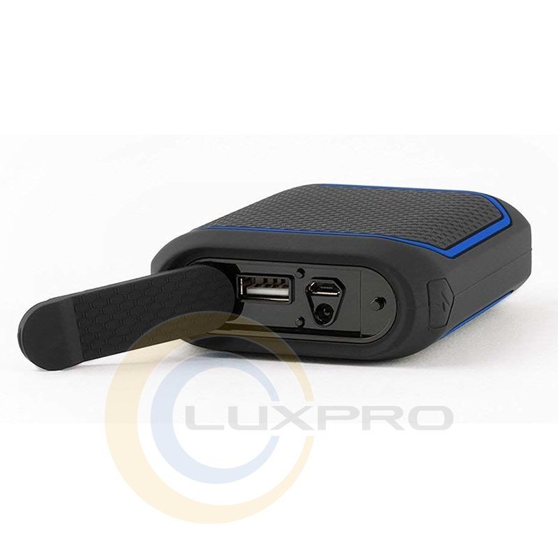 Разработан для защиты от пыли и воды IP55, аккумулятор имеет порты для зарядки и питания, встроенный аварийный фонарик, который защищен самоуплотняющейся заслонкой.