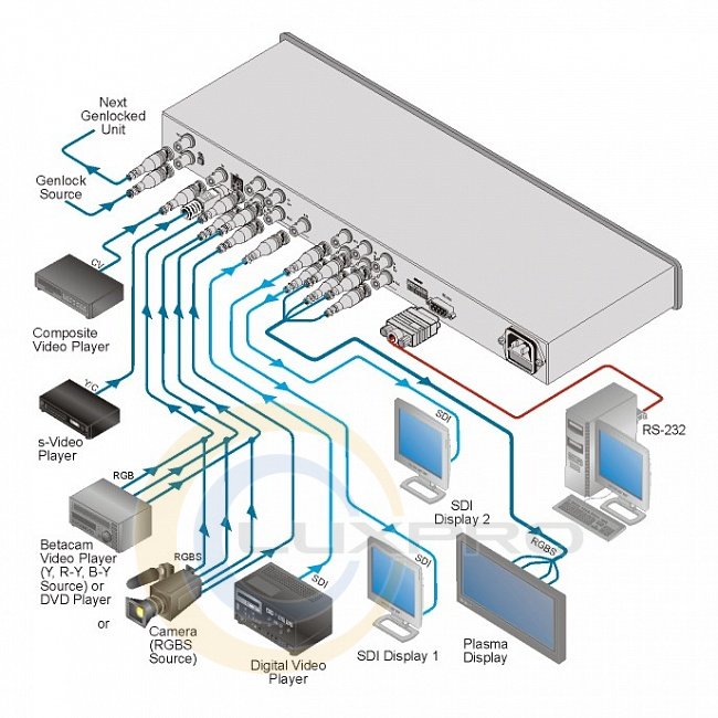 - выходы: композитный видеосигнал (1 вых.): размах 1 В, 75 Ом, разъем BNC, YC (1 вых.): 1 В (Y), 0,3 В (C), 75 Ом, два раз-а BNC, Компон. или RGB/S (1 вых.): 1 В/0,7 В/0,7 В, 75 Ом, разъемы BNC, SDI (2 вых.): SMPTE-259M, ITU-R ВТ.601, раз-ы BNC;