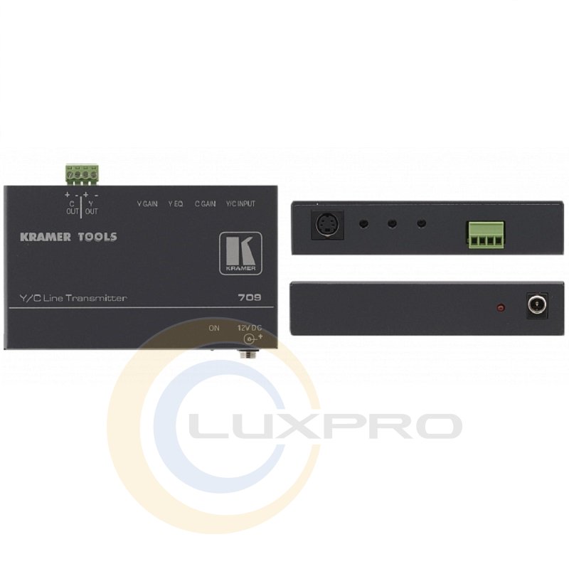 устройство 709. Для применения в системах с несколькими мониторами приемник 710 оснащен проходным гнездом с переключателем эквивалентной нагрузки, которое позволяет подключить несколько приемников 710 к передатчику 709 по одному кабелю витой пары. Частотный диапазон сигнала при длине кабеля до 400 метров составляет 6 МГц (на меньших расстояниях обеспечивается вещательное качество сигнала). Имеются регуляторы уровня сигнала и контроля АЧХ. В комплект входит источник питания 12 В. 709 и 710 относятся к семейству TOOLS - группе компактных приборов с оптимальным соотношением «цена-качество» и широким спектром применения.