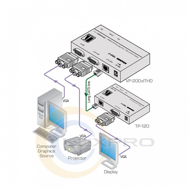 Прибор. Усиленный и откорректированный входной сигнал выдается на 15-контактный разъем VGA и выход на витую пару RJ-45.
