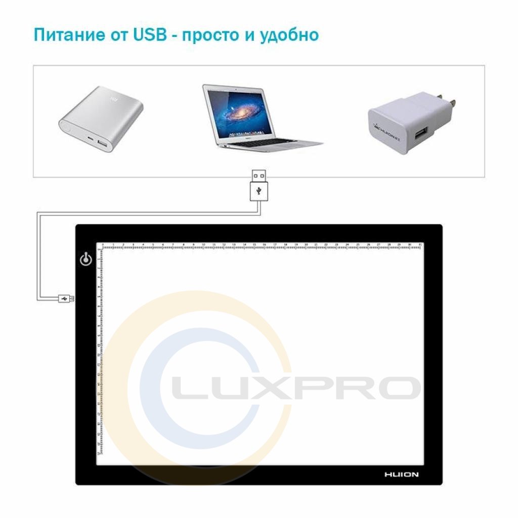 Формат А4 и толщина в 5 мм, а также акриловая поверхность делает планшет похожим на стеклянную панель. Световой поток - 110LM, позволяет хорошо просвечивать даже очень плотную бумагу.