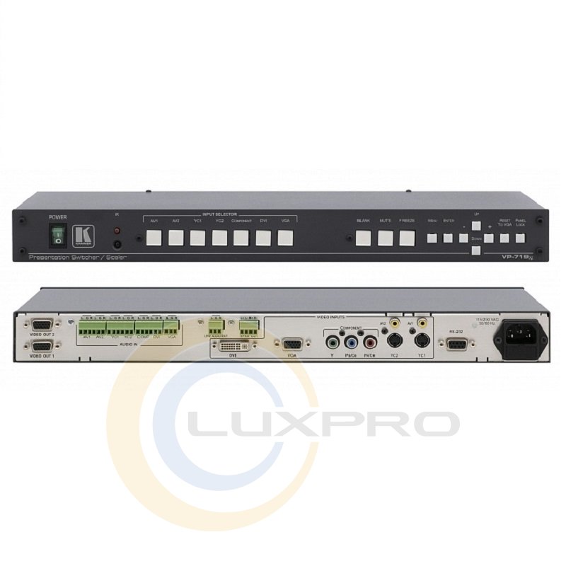 У прибора два параллельных выхода с разъемами HD15, на которые выдается графический видеосигнал. На передней панели имеются дополнительные кнопки: "BLANK" для гашения экрана, "MUTE" для отключения звука, "FREEZE" для включения стоп-кадра, "RESET TO VGA" для аппаратного сброса выходного разрешения и "PANEL LOCK" для блокирования кнопок передней панели. Прибор имеет встроенный аудиоусилитель с мощностью 7 Вт (среднеквадратичное значение) на канал, достаточной для озвучивания комнаты для проведения презентаций. Громкость регулируется кнопками передней панели. VP-719xl, используя технологию масштабирования K-Storm™, преобразует сигнал в цифровой форме, корректируя ошибки оригинала и формируя выходной сигнал с большим, чем в оригинале, числом строк и элементов изображения.