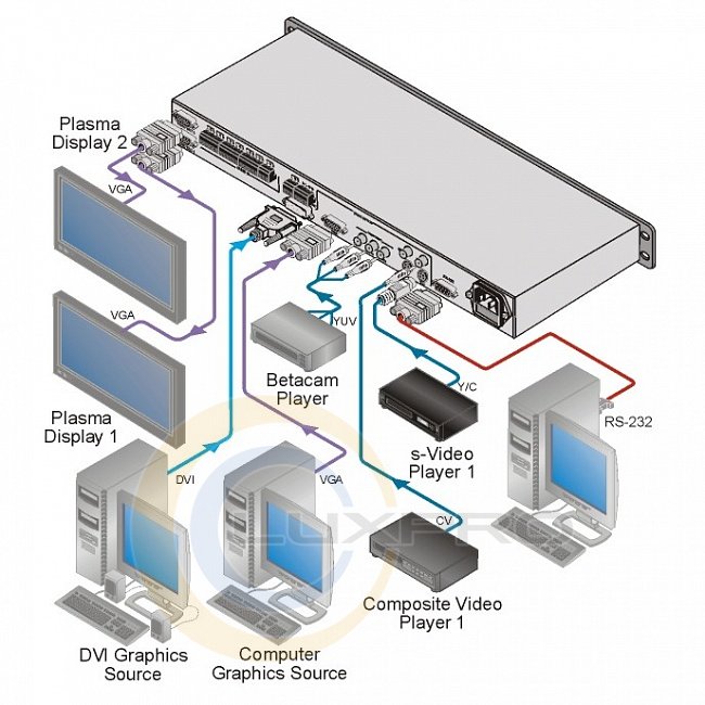 - прогрессивная или чересстрочная развертка, разъемы RCA), 1 DVI-D, 1 VGA (VGA-UXGA + HDTV), разъем HD15F. Для каждого входа имеется соответствующий вход небалансного стереофонического аудиосигнала на клеммном блоке;