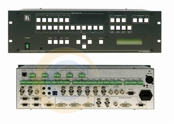 - выходы масштабатора: 1 х RGBHV (формата VGA)/компонентный HDTV на разъеме HD15F; 1 х RGBHV/YPbPr на разъёмах BNC; 1 x DVI-D на разъёме DVI-I. : 6 х балансного стерео аудио на клеммных модульных разъёмах, 22 дБ;