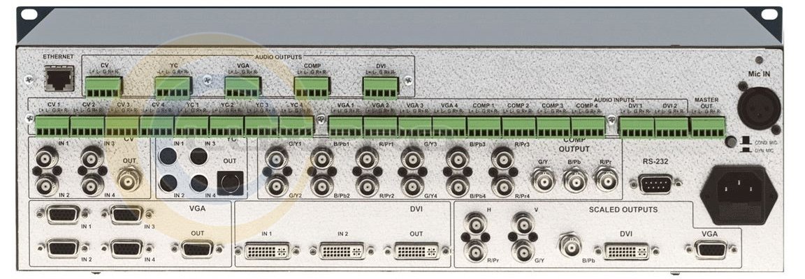 - входы: 4 х CV 1 В/75 Ом (BNC); 4 х YC на 4-конт. разъемах, 1 В(Y), 0,3 В(C)/75 Ом; 4 х компон.(Y/G, Pb/B, Pr/R), (BNC); 4 х VGA(от VGA до UXGA), (HD15F); 2 x DVI-D (DVI-I). : 18 х баланс. стерео аудио на клемм. модульн. разъёмах, 22 дБ; микрофон. (XLR);