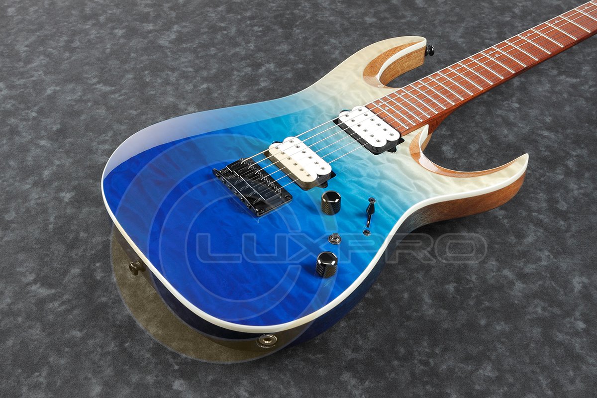 RGA42HPQM BIG - электрогитара созданная для следующего поколения музыкантов. Обладая великолепной отделкой «Gradation» с прозрачными скошенными вырезами - другие ключевые элементы включают хамбакеры DiMarzio Fusion Edge, суперпрочный бридж F106 и тонкий гриф из жареного клена «Wizard III».