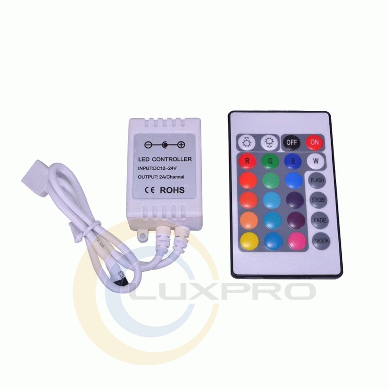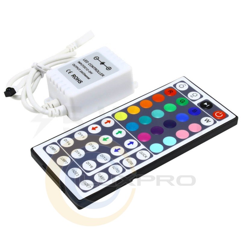 RGB Контроллер на 44 кнопки 6А. Радиус действия ИК-пульта управления до 10 метров, имеет 24 кнопки, прямой выбор статических цветов (16 цветов) и 4 динамический режима переключения. ИК выводится наружу, длина провода 20см.