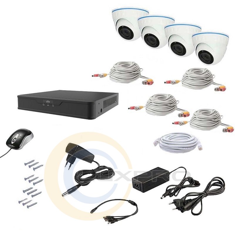 - комплект видеонаблюдения состоит из 4х видеокамер разрешением 2 Мп, сетевого видеорегистратора, кабелей для подключения и монтажного комплекта, необходимого для самостоятельной установки;