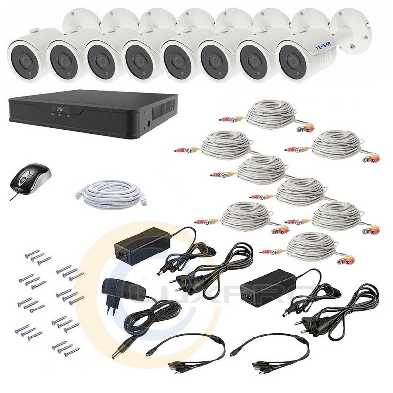 - комплект видеонаблюдения состоит из 8-ми камер разрешением 2 Мп, сетевого видеорегистратора, кабелей для подключения и монтажного комплекта, необходимого для самостоятельной установки;