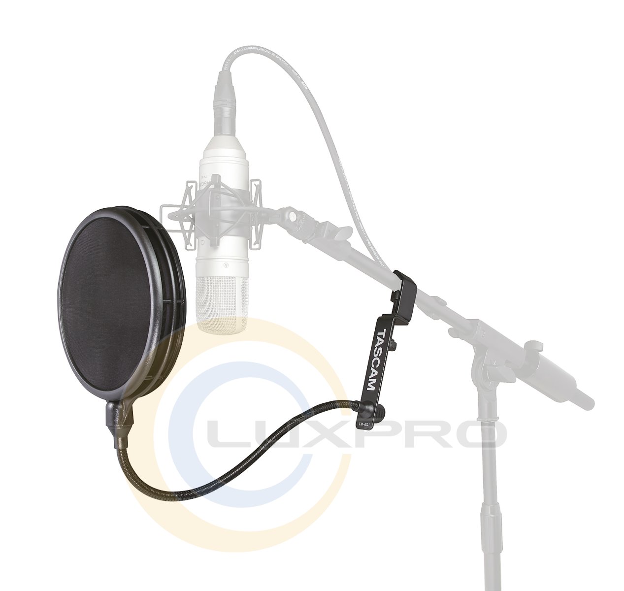 TASCAM TM-AG1 состоит из двухслойного нейлонового экрана с боковыми вентиляционными отверстиями, который эффективно уменьшает взрывные вокальные поп-звуки («P-Pops»), возникающие во время речи и пения, а также защищает микрофон от слюны. Держатель «гусиная шея» длиной 351 мм обеспечивает достаточное расстояние для установки, а также регулировки микрофона в различных положениях.