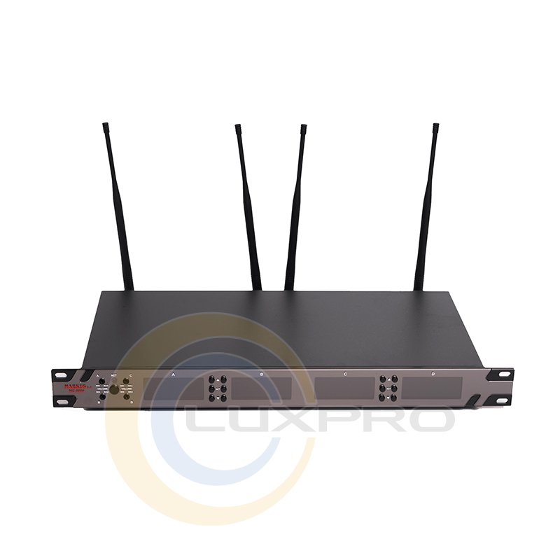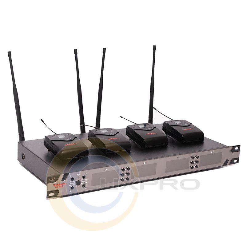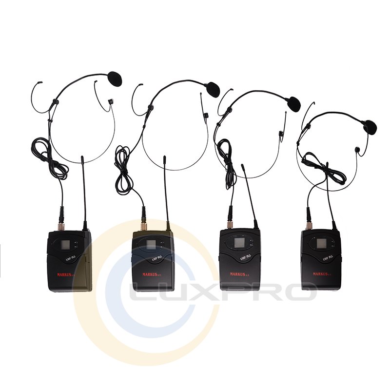 Главная радиосистема Markus МС 9000. Диапазон UHF (500-960MHz), 4 канала. Микрофонные гарнитуры цвет (кожа), 4 шт. Синтезированный PLL, 200 каналов позволяет использовать 4 системы одновременно (16-микрофонов) с уверенным приемом. Стандарт - 1U двухканальный для монтажа в стойку с металлическим корпусом.
