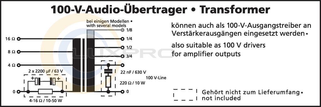 TR-1120LC - преобразователь 100 В. Внешний трансформатор 100 В необходим для усилителя или динамика без установленного звукового трансформатора 100 В. Каждый из предлагаемых аудио трансформаторов на 100 В может использоваться.