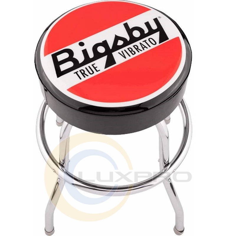 Барный стул BARSTOOL 24" BIGSBY ROUND LOGO украшен логотипом Bigsby True Vibrato сверху. У него черные бока и хромированные ножки. Представлен в размере 24".