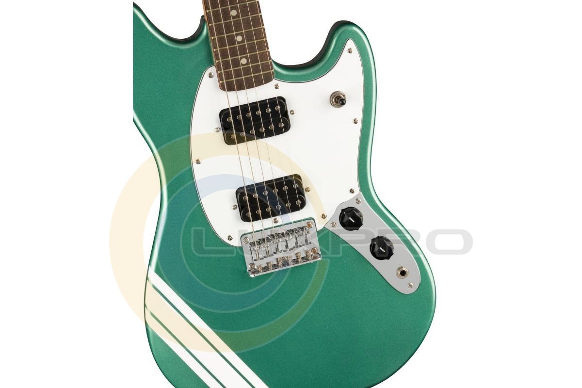 FENDER BULLET MUSTANG FSR HH SHERWOOD GREEN - электрогитара, может похвастаться отделкой в стиле «соревновательной полосы», которая непременно будет выделяться на сцене! Среди других ключевых новинок - прочный хардтейл-бридж и мощные хамбакеры.Характеристики: