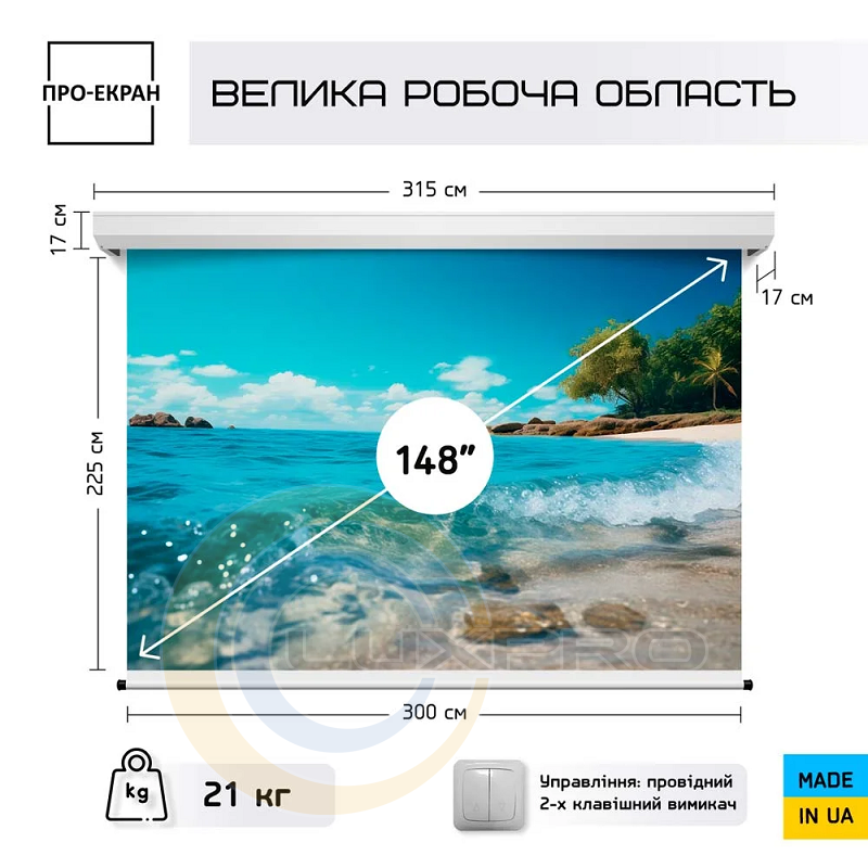 - комплектация: экран (1 шт.), монтажный комплект (1 шт.), провод питания 1 м (1 шт.), проводной 2-х клавишный выключатель (1 шт.);