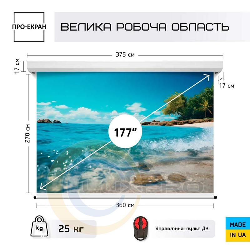 - комплектация: экран (1 шт.), монтажный комплект (1 шт.), провод питания 1 м (1 шт.), пульт ДУ (1 шт.);