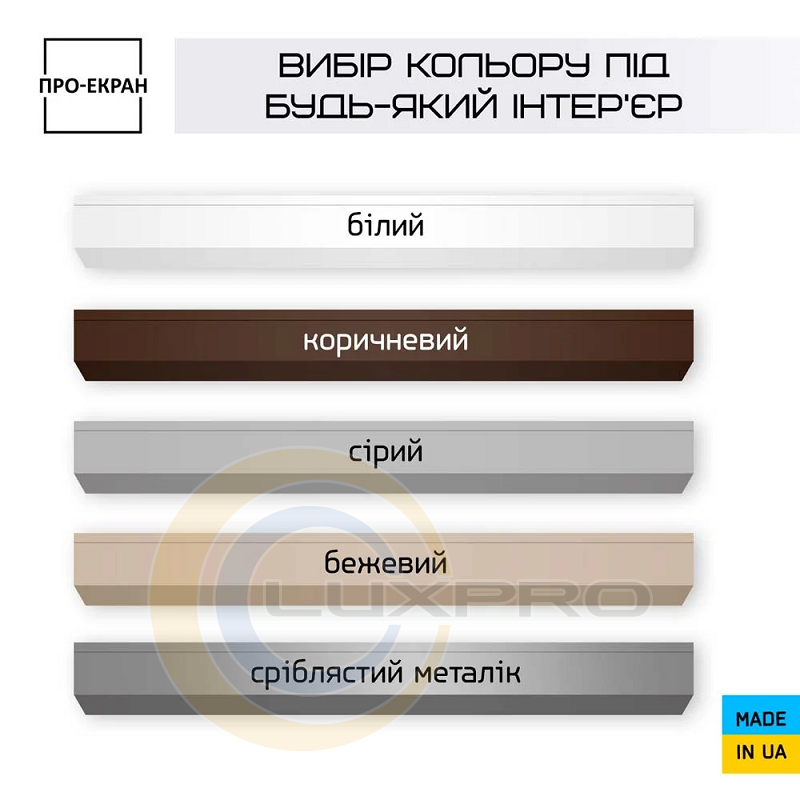 Элегантный дизайн и возможность заказа различных расцветок корпуса (белый, коричневый, серый, бежевый, серебристый металлик) помогут удачно вписать экран в любой интерьер. Цену и срок изготовления для расцветок кроме белого и коричневого уточняйте у менеджера.