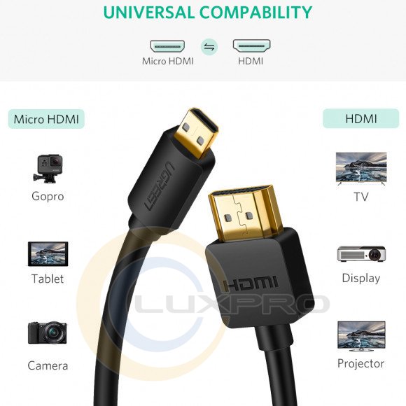 UGREEN HD127 microHDMI to HDMI, 2 m, v2.0 UltraHD 4K-3D Black 30102. Подключите ваше портативное устройство с разъемом micro HDMI к монитору с разъемом HDMI и наслаждайтесь видео в высоком разрешении на большом мониторе. С одной стороны у кабеля UGREEN HD127 microHDMI to HDMI v2.0 UltraHD 4K-3D Black коннектор micro HDMI, который вы можете подключить к фотоаппарату, видеокамере, планшету, ноутбуку и любому другому гаджету с таким разъемом. С другой – коннектор HDMI, который подключается к монитору или телевизору. Позолоченные контакты обеспечивают стабильный сигнал. Коннекторы соединены надежным толстым проводом с тройным экранированием.