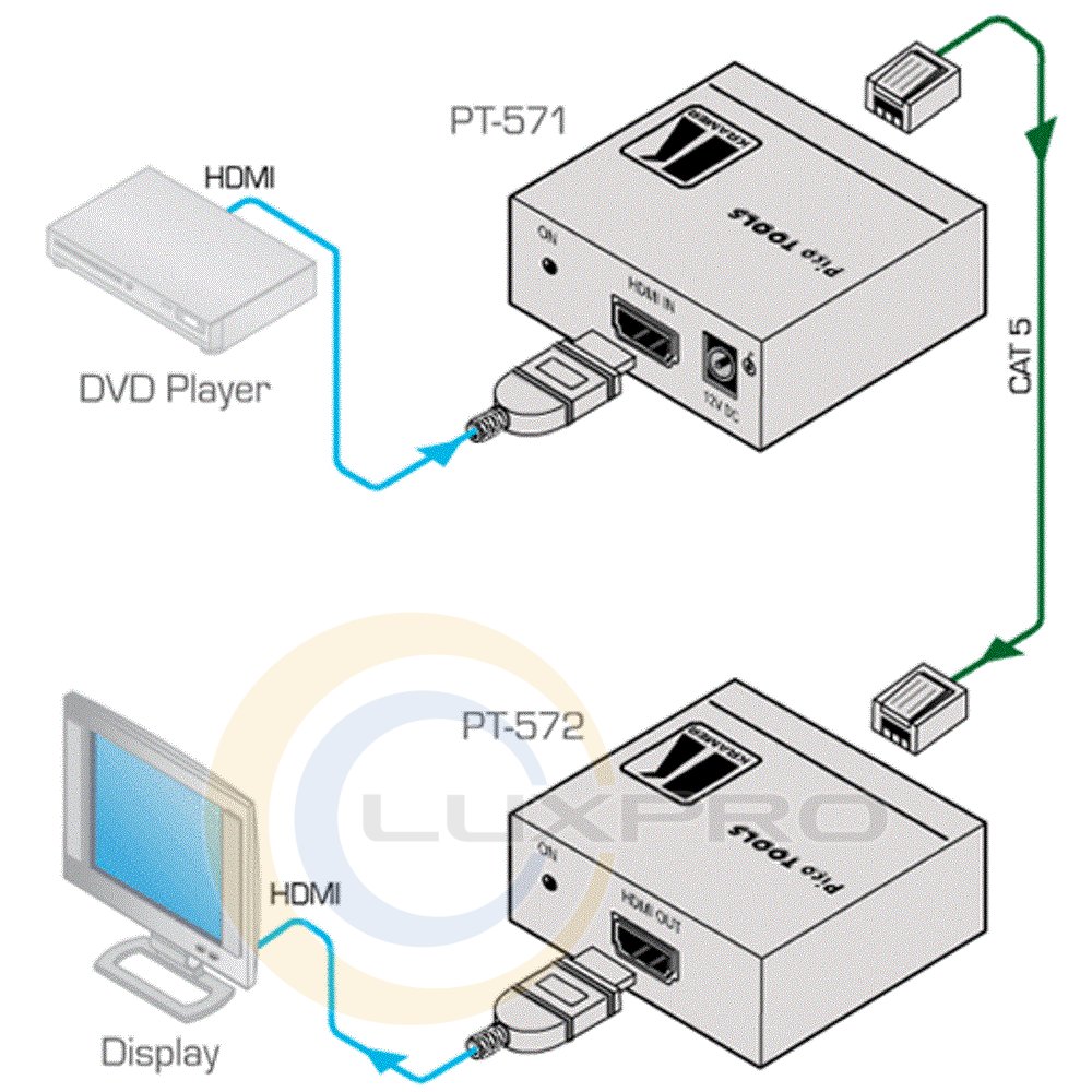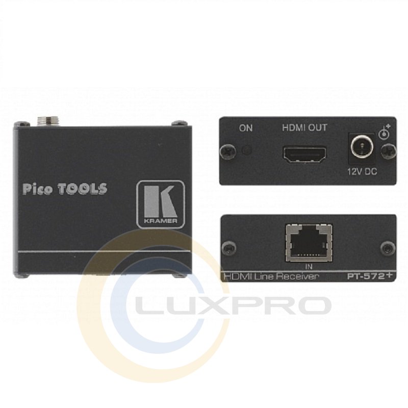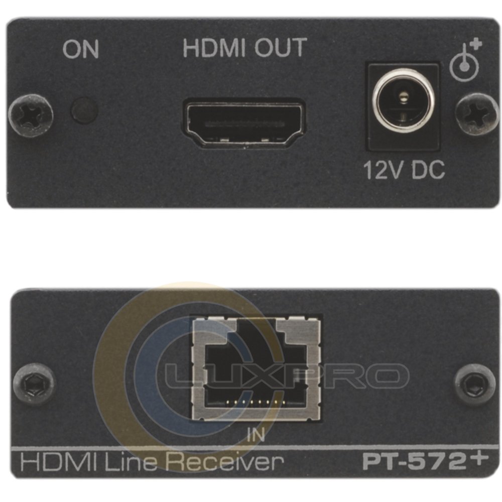 Приемник сигнала HDMI из кабеля витой пары (TP) с адаптером питания. PT-572+ - приемник сигнала HDMI по кабелю на витой паре. PT-571 преобразует сигнал HDMI в формат для такой передачи, PT-572+ выполняет обратное преобразование.Характеристики: