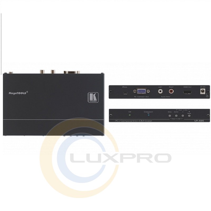 Цифровой масштабатор сигнала VGA/YPrPb сигнала в HDMIVP-425 - высококачественный цифровой масштабатор сигнала VGA и компонентного сигнала высокой четкости со встроенным эмбеддером. Прибор выполняет преобразование входного сигнала с повышением или понижением разрешения и эмбеддирует аудиосигнал в выходной сигнал HDMI.Характеристики: