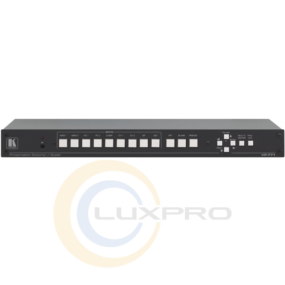 Масштабатор видео и графики, коммутатор без подрывов сигнала, передатчик в витую паруVP-771 – бесподрывный презентационный коммутатор и масштабатор с 9 входами, включая HDMI, DisplayPort, VGA, HD-SDI 3G, компонентного и композитного видео. Устройство масштабирует видеосигнал, вводит аудиосигнал и выдает результат на выходы HDMI, VGA, 3G HD-SDI и DGKat в витую пару одновременно с цифровым и аналоговым небалансным стереофоническим аудиосигналом. Оборудован усилителем звука. Усиленный звук выдается на балансный выход для подключения стереофонических громкоговорителей 10 Вт.Характеристики: