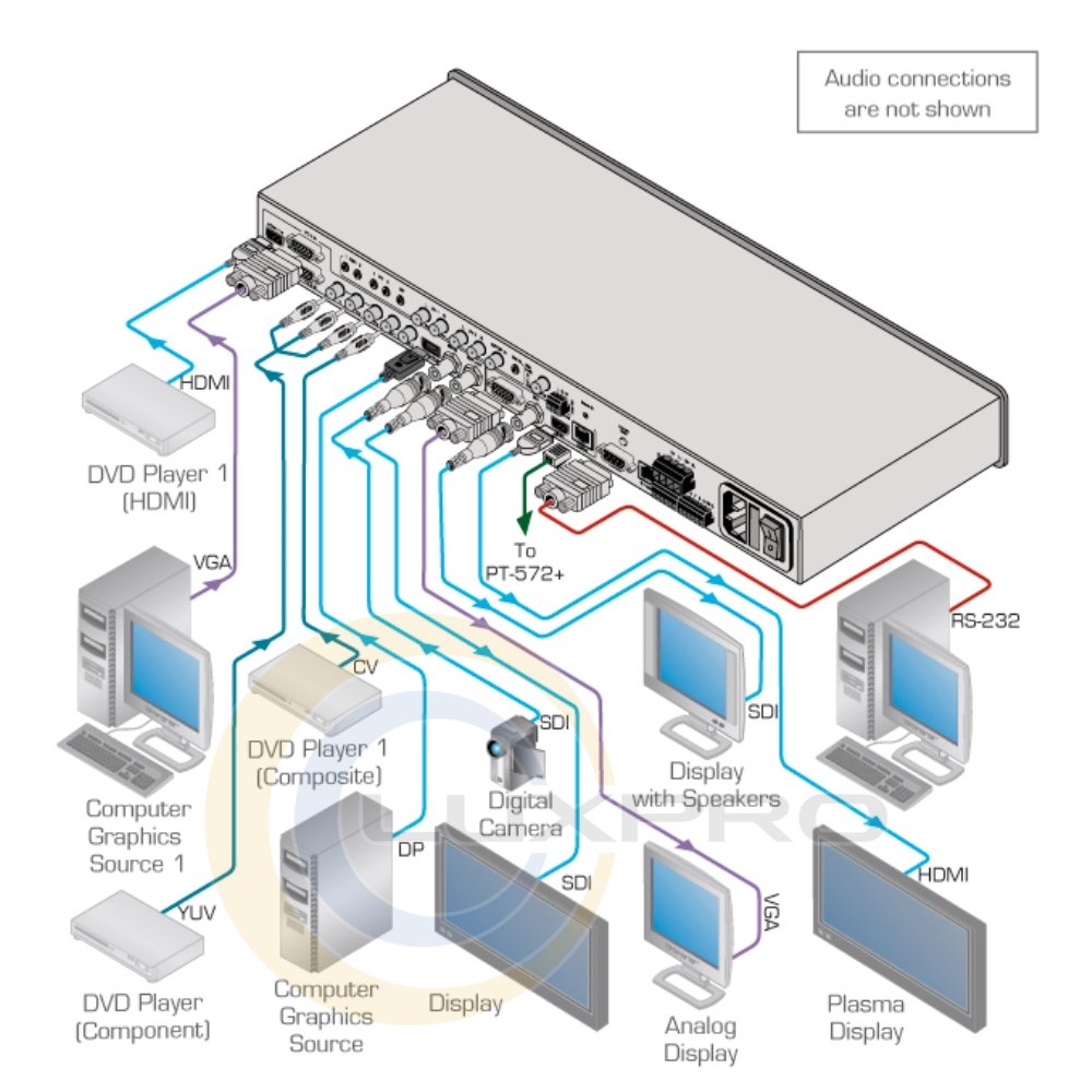 - выходы - 1 – VGA, 15-контактный разъем HD (розетка); 1 – SDI (SD/HD/3G HD-SDI), разъем BNC (розетка); 1 – HDMI, тип «A» (розетка); 1 – витая пара DGKat, разъем RJ-45 (розетка); 1 – цифровое аудио S/PDIF, разъем RCA (розетка); 1 – аудио стерео, 3-контактный клеммный блок; 1 – балансное аудио стерео (усилитель мощности), 2x10 Вт, клеммные блоки;