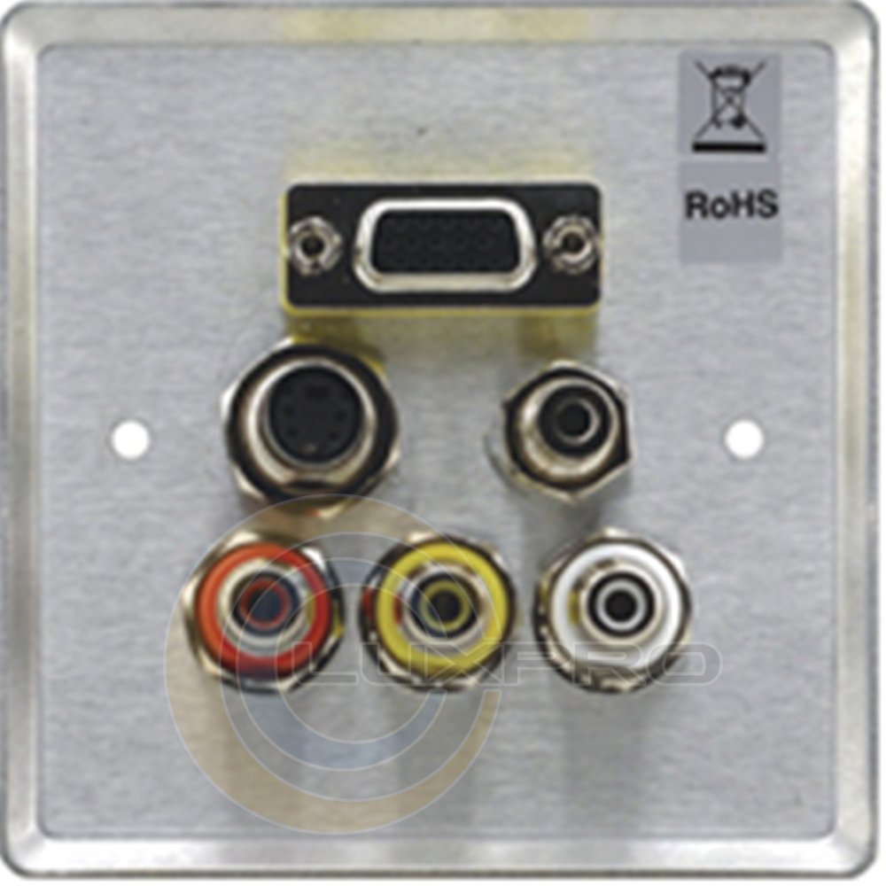 Панель c проходными разъемами D-sub HD15, mDIN 4pin, RCA, mJack, для ВеликобританииWAV-6YC/EU/GB - панель снабжена проходными разъемами D-sub HD15, mDIN 4pin, тремя RCA и стерео mJack 3.5мм. Подходит для коммутации сигналов компьютерной графики, композитного видео или SDI, S-Video, компонентного видео и небалансного стерео аудио сигнала. Панель выпускается в двух вариантах для американского и европейского рынков. Исполнение для Великобритании.Характеристики:
