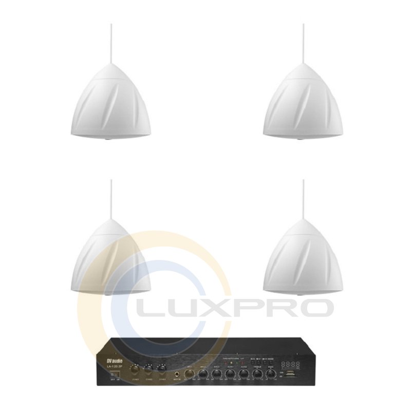 Акустический комплект LA1204PS5W. Подвесная акустическая система DV audio PS-502T. Подвесной громкоговоритель может применяться в самых различных областях. Это полнофункциональные громкоговорители для воспроизведения речи и музыки в магазинах, торговых центрах, школах, офисах, спортивных залах, гостиницах и ресторанах. В комплект входят цельный громкоговоритель мощностью 30W в целостном пластиковом корпусе. С лицевой стороны встроенная круглая металлическая решетка.