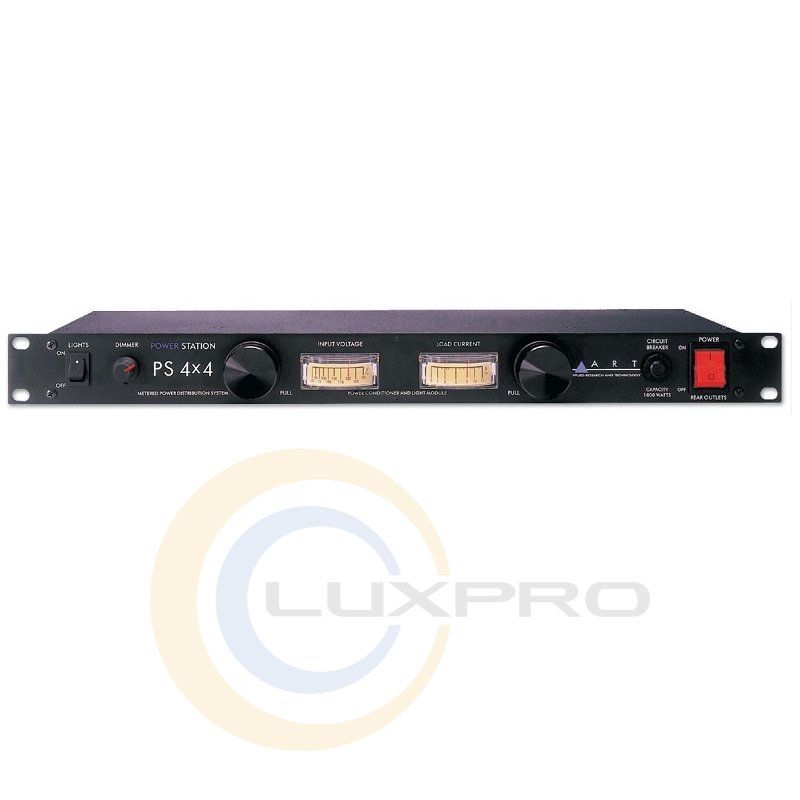Кондиционер питания PS 4x4 рассчитан на мощность 1800 Вт, обеспечивает фильтрацию и защиту от всплесков напряжения. На передней панели расположены две выдвижных лампочки подсветки, защищенные от вибрации, выключатель подсветки и регулятор яркости, стрелочные индикаторы сетевого напряжения и тока нагрузки (с подсветкой), автоматический предохранитель на 15 А, сетевой выключатель.На задней панели находятся гнездо сетевого кабеля и восемь розеток, четыре из которых расположены на расстоянии 1,25" друг от друга, что позволяет подключать к соседним розеткам крупногабаритные вилки и адаптеры. Устройство выполнено в однорэковом стальном корпусе.Характеристики: