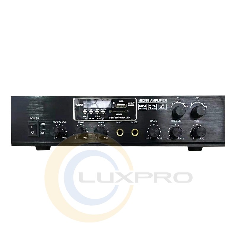 MPA60 2zone MP3/FM/BT REMOTE - усилитель мощности, который усиливает мощность электрических звуковых сигналов. Он необходим при трансляции фоновой музыки, голосовых объявлений, сигналов тревоги на большой территории. Именно площадь пространства служит главным фактором, требующим использования усилителя. Это связано с тем, что при увеличении расстояния возрастает длина линий связи. В свою очередь, чем длиннее линии связи, тем больше потери мощности звука.