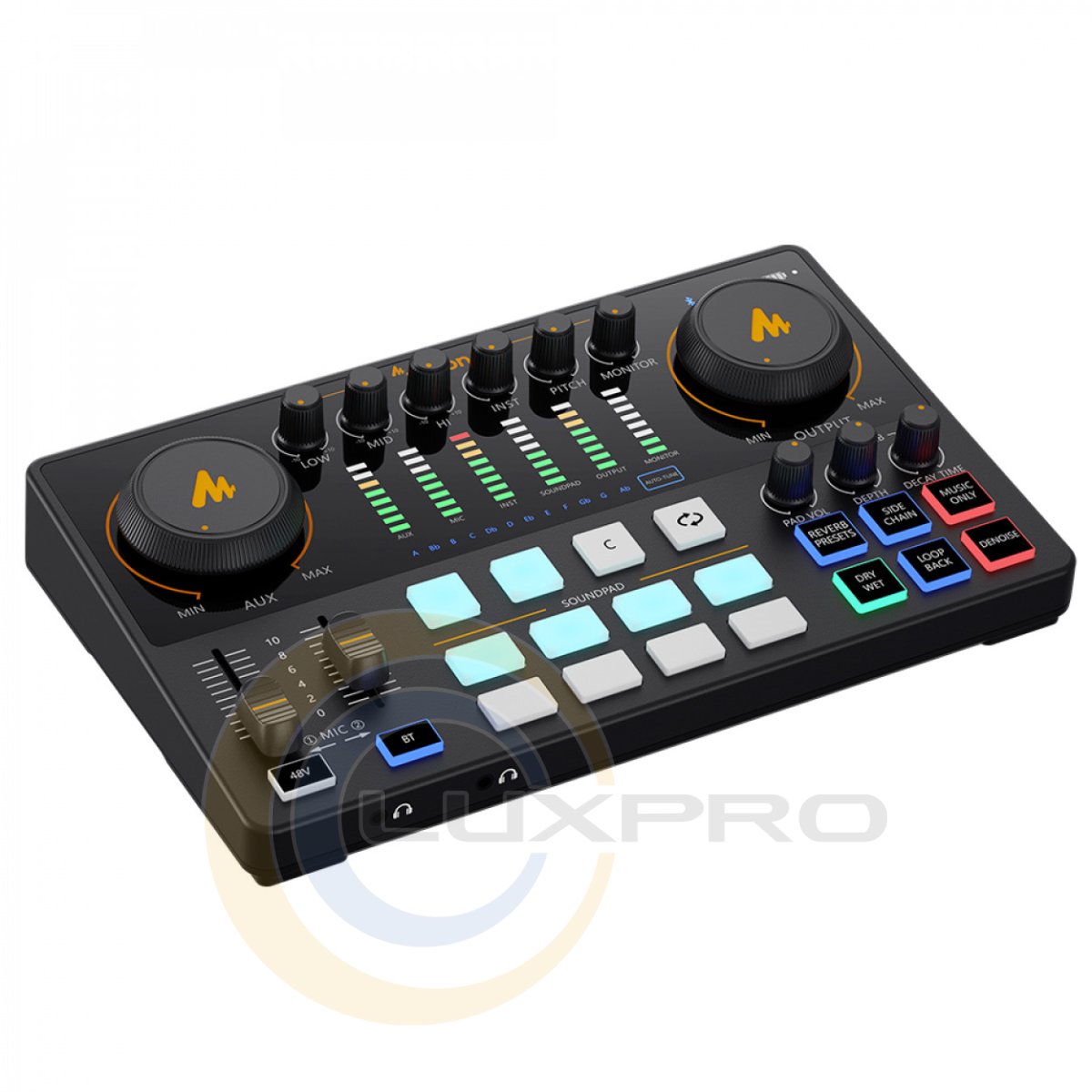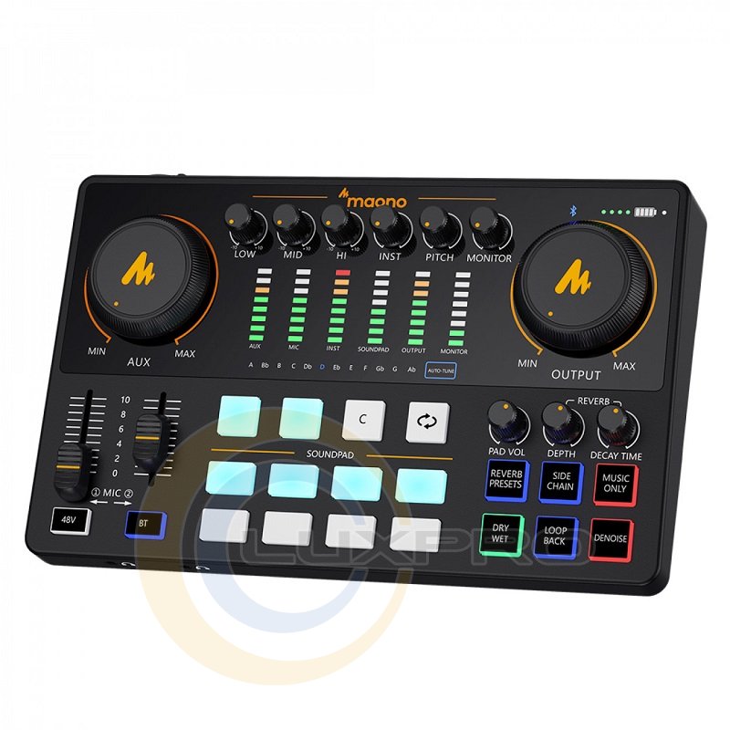 Громкость каждого микрофона, звуковой панели, монитора, входа и выхода можно настроить индивидуально, чтобы наслаждаться подкастом. Оборудование с 6 режимами реверберации. Вы можете свободно регулировать время и глубину реверберации, 12-ступенчатая автонастройка, 3 изменяемых тона (высокие, средние и низкие частоты) и ручки изменения высоты тона. Каждый микрофонный вход управляется независимо. Также включены функции Pro, такие как боковая цепь, только музыка и переключатель обратной связи.