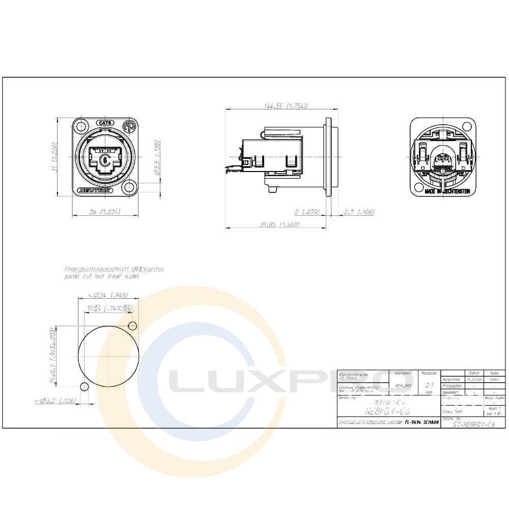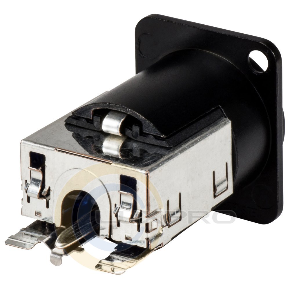 Профессиональное панельное гнездо EtherCon с разъемом RJ45 и защелкой под монтаж на шасси с формфактором - D, контакты под обжим, бронзовые контакты с позолотой.