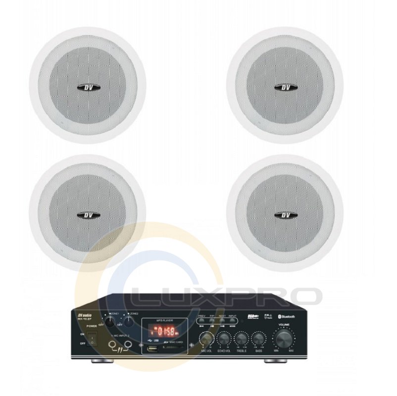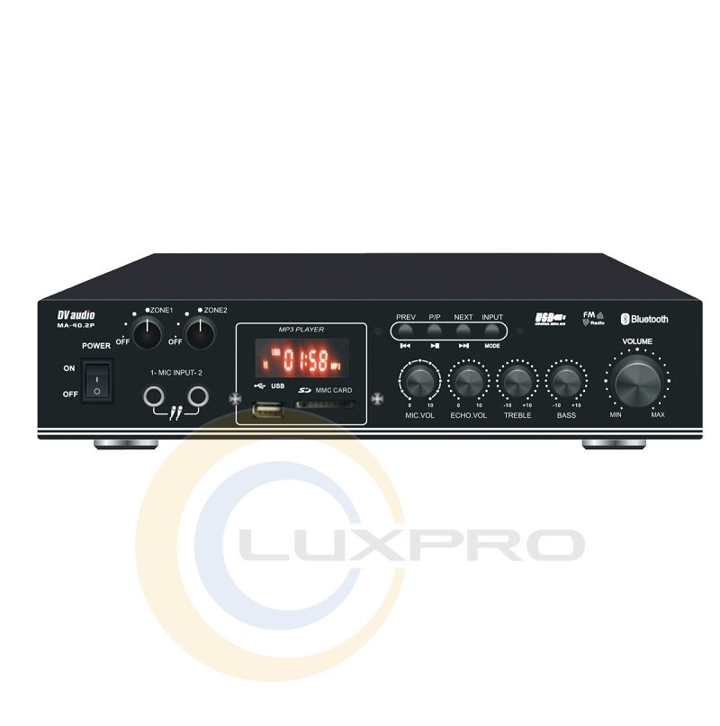 Акустический комплект MA404501. Микширующий усилитель мощности DV audio MA-40.2P. Усилитель оснащен встроенным USB-проигрывателем, FM-тюнером, а так же возможностью воспроизведения аудио через Bluetooth. Кроме этого имеет два микрофонных входа, два линейных входа и линейный выход. USB-проигрыватель поддерживает флеш-накопитель объемом памяти до 16Гб. Управление усилителем может осуществляется с лицевой панели устройства или с помощью дистанционного пульта управления. Усилитель выполнен в компактном корпусе высотой 1,5U.