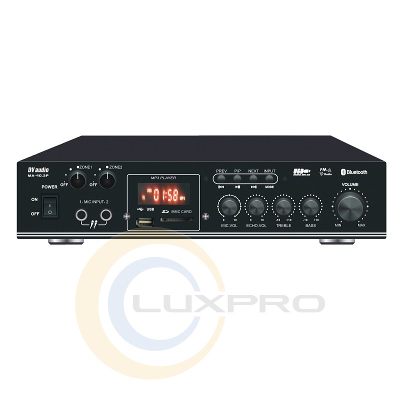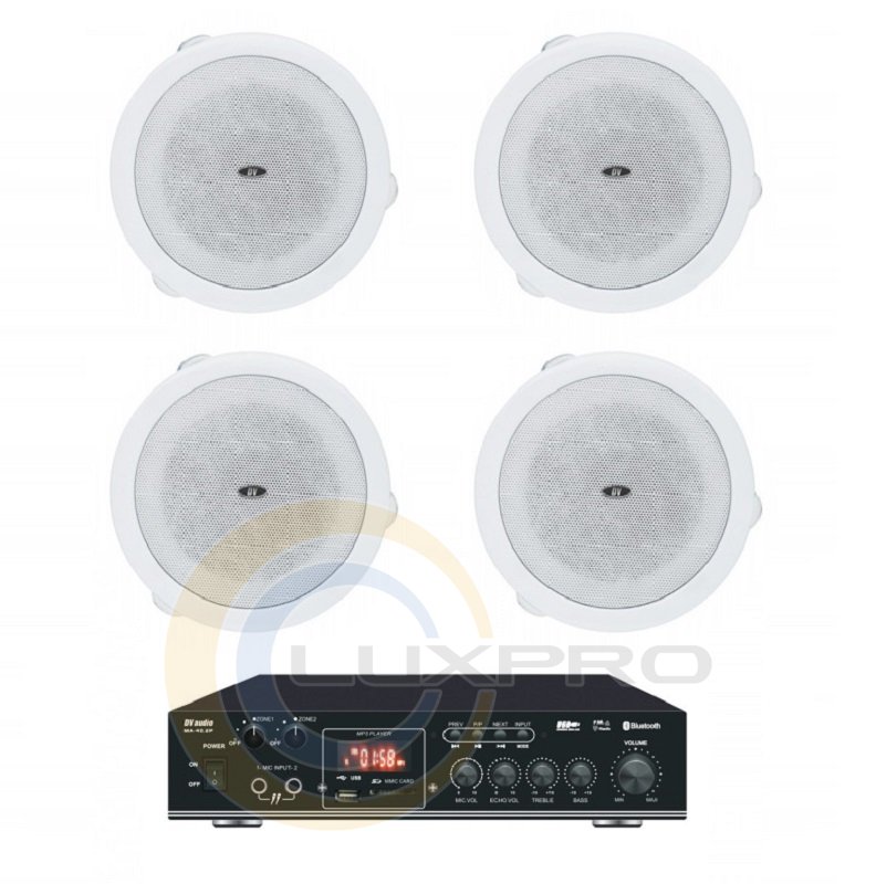 Акустический комплект MA40486. Микширующий усилитель мощности DV audio MA-40.2P. Усилитель оснащен встроенным USB-проигрывателем, FM-тюнером, а так же возможностью воспроизведения аудио через Bluetooth. Кроме этого имеет два микрофонных входа, два линейных входа и линейный выход. USB-проигрыватель поддерживает флеш-накопитель объемом памяти до 16Гб. Управление усилителем может осуществляется с лицевой панели устройства или с помощью дистанционного пульта управления. Усилитель выполнен в компактном корпусе высотой 1,5U.