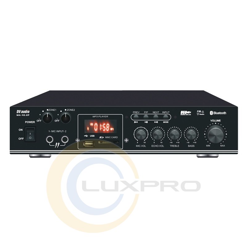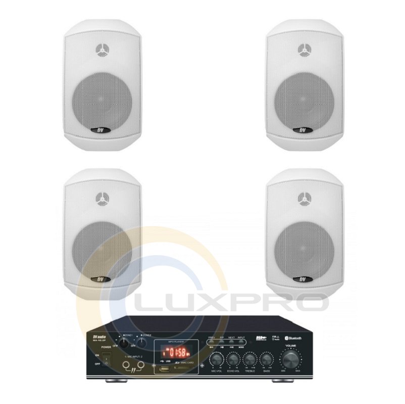 Акустический комплект MA404MS4W. Микширующий усилитель мощности DV audio MA-40.2P со встроенным USB-проигрывателем и FM-тюнером , а так же возможностью воспроизведения через BLUETOOTH. Применяется в системах фонового озвучивания. Оснащен двумя микрофонными входами, двумя линейными входами и линейным выходом. Управление USB-проигрывателем осуществляется с помощью кнопок stop/play, повтор, предыдущий трек, следующий трек с лицевой панели усилителя. USB-проигрыватель поддерживает USB-флешки максимальным объемом памяти до 16гб. Управление FM-тюнером осуществляется так же с лицевой панели усилителя или с дистанционного пульта управления. Усилитель выполнен в компактном корпусе высотой 1,5U для монтажа в рэковую стойку не предназначен.