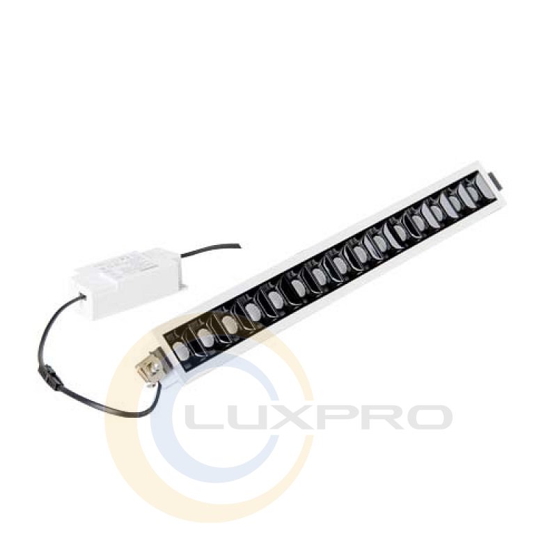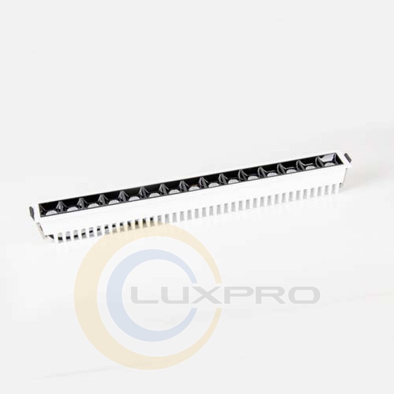 GRILLE-15 WH - cветильник. Корпус светильника сделан из алюминиевого сплава, оптика рассеивает луч света под углом 15 или 45°. Светильник можно купить с температурой света в 3000К (теплый белый свет) или 4000К (нейтральный белый свет). Блок питания расположен в корпусе светильника, поэтому на него необходимо подать обычные 220В, мощность прибора – 30 Вт. Качественные светодиоды от мирового бренда Osram не только позволяют получить яркий свет при минимальных затратах на электроэнергию, но и отлично передают цвета, так как показатель цветопередачи составляет >90.