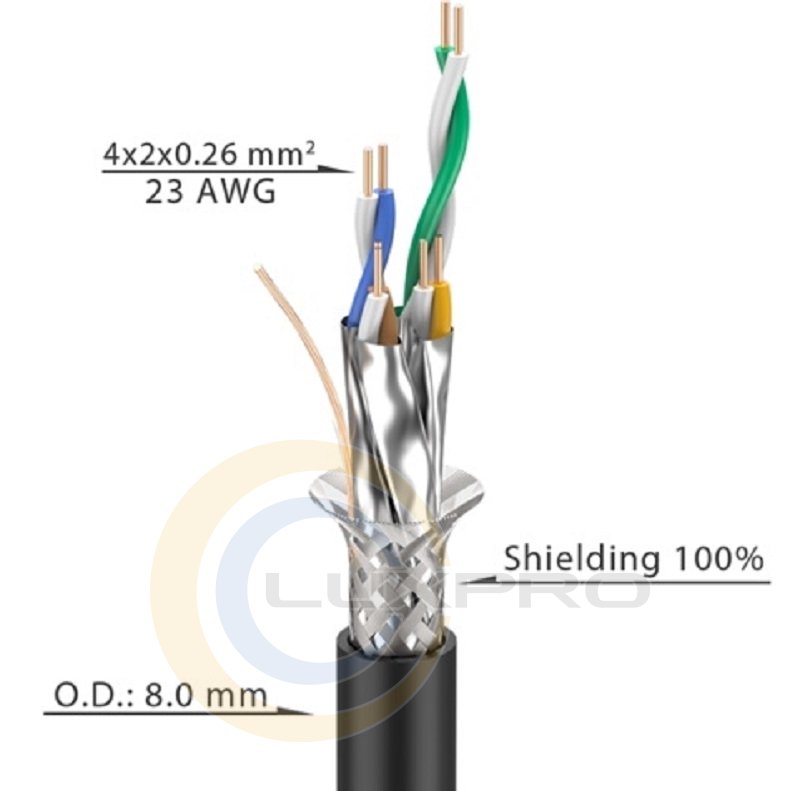 - кабель категории 6 для передачи данных, низкий перекос задержки, диаметр 8 мм, 4x2x0,26 мм;