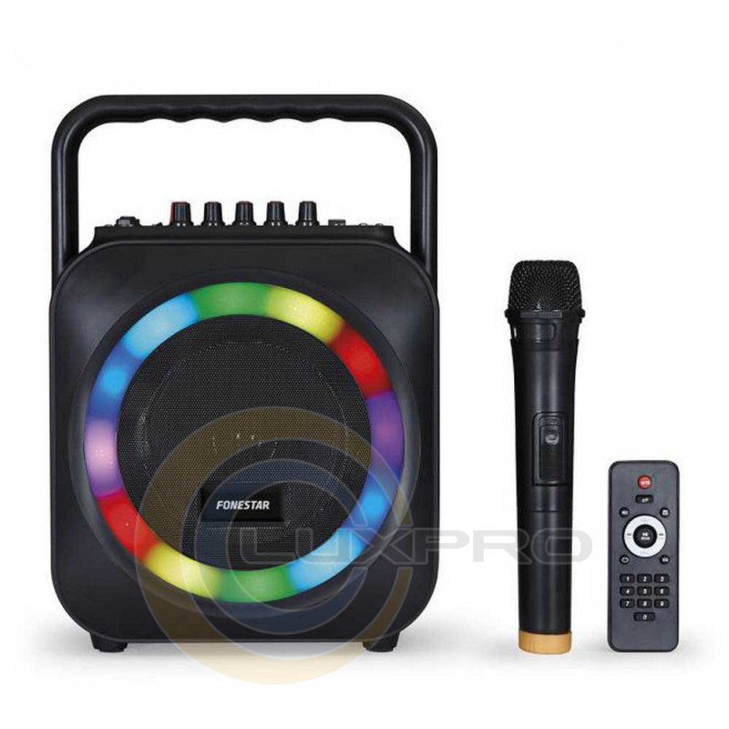Включает беспроводной портативный микрофон и пульт дистанционного управления. Ее простое и интуитивно понятное использование сводит к минимуму время настройки в зависимости от использования. Применение: караоке, создание нужной визуальной и музыкальной атмосферы для небольших мероприятий, вечеринок, путешествий и мероприятий на свежем воздухе.