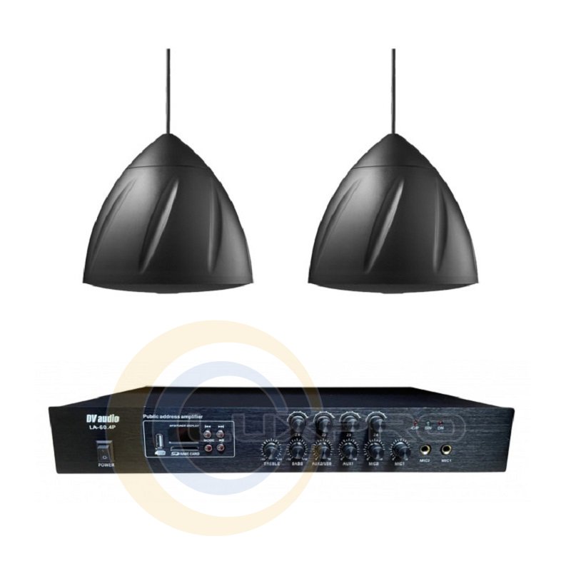 Акустический комплект LA602PS5B. Подвесная акустическая система DV audio PS-502TB 2 шт. Подвесной громкоговоритель может применяться в самых различных областях. Это полнофункциональные громкоговорители для воспроизведения речи и музыки в магазинах, торговых центрах, школах, офисах, спортивных залах, гостиницах и ресторанах. В комплект входят цельный громкоговоритель мощностью 30W в целостном пластиковом корпусе. С лицевой стороны встроенная круглая металлическая решетка.