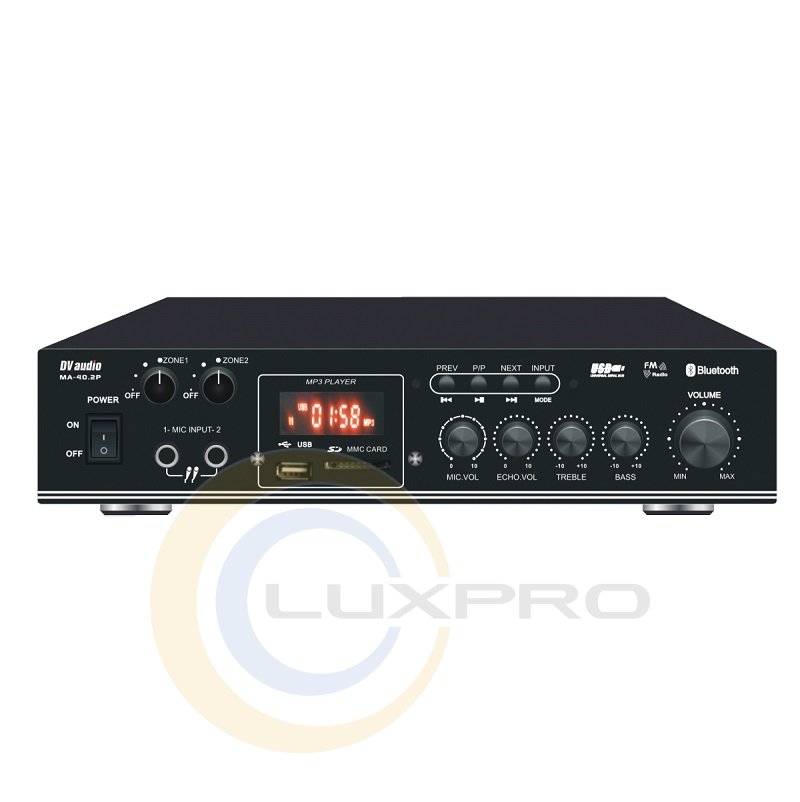 Акустический комплект MA402CON1B. Микширующий усилитель мощности DV audio MA-40.2P 1 шт. Микширующий усилитель мощности DV audio MA-40.2P со встроенным USB-проигрывателем и FM-тюнером , а так же возможностью воспроизведения через BLUETOOTH. Применяется в системах фонового озвучивания. Оснащен двумя микрофонными входами, двумя линейными входами и линейным выходом. Управление USB-проигрывателем осуществляется с помощью кнопок stop/play, повтор, предыдущий трек, следующий трек с лицевой панели усилителя. USB-проигрыватель поддерживает USB-флешки максимальным объемом памяти до 16гб. Управление FM-тюнером осуществляется так же с лицевой панели усилителя или с дистанционного пульта управления. Усилитель выполнен в компактном корпусе высотой 1,5U для монтажа в рэковую стойку не предназначен.