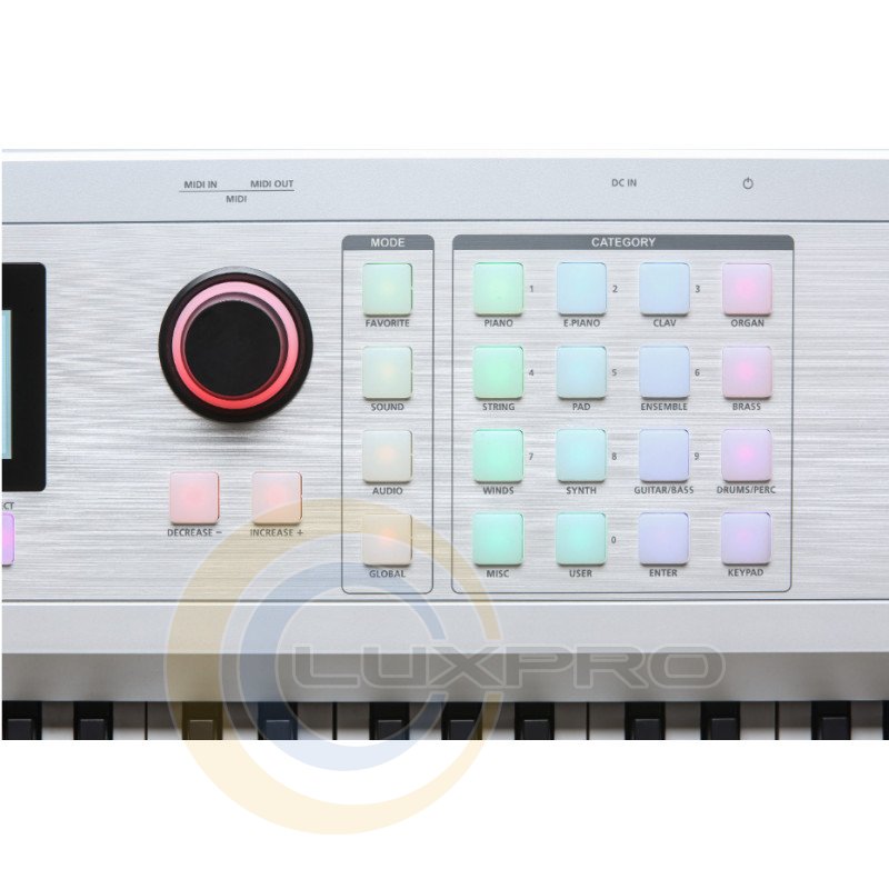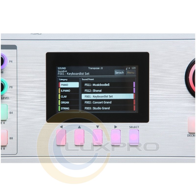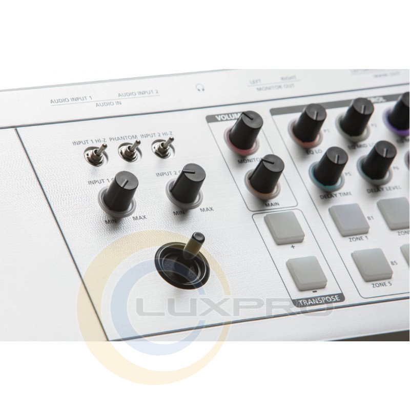 Пианино оснащено стильной и крайне удобной панелью управления. Прежде всего, обратим внимание на большой и яркий сенсорный дисплей, который делает работу с устройством максимально комфортной. Встроенный аудиоинтерфейс 2 х 2 (24 бит/48 кГц) оснащен отдельный блоком управления. Отметим, что многие органы управления можно запрограммировать по собственному усмотрению, а настраиваемая подсветка регуляторов и пэдов позволяет быстрее ориентироваться и обеспечивается невероятно эстетичный внешний вид.