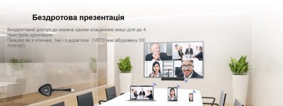 Благодаря встроенному Android компьютеру не нужен. Просто начните телеконференцию с помощью программы, которую вы предпочитаете, с компьютера или с VB70. Подключите его к дисплею и вы готовы к работе. Беспроводной доступ к экрану одним щелчком для одновременного доступа к 4 устройствам.