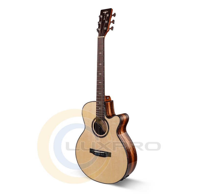 Электроакустическая гитара A2 Custom-ZL. Верхняя дека выполнена из массива ситхинской ели, нижняя дека и обечайка из африканского эбенового дерева. Ель обладает ярким, звонким звучанием, а эбони усиливает и добавляет объемности звуку. Гриф из махагони и накладка грифа, выполненная из индийского палисандра, раскроют глубокий тембр инструмента и придадут ему красивую текстуру. Пьезозвукосниматель с трансакустическим датчиком и микрофоном открывает возможности для различных музыкальных экспериментов.